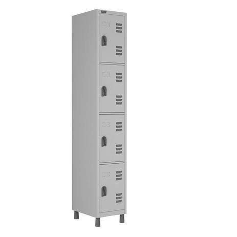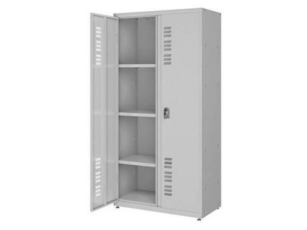 Possui 2 portas de abrir com 3 reforços internos tipo oméga no sentido horizontal, puxador estampado na própria porta no sentido vertical, com acabamento em PVC, possui sistema de cremalheira para regulagem das prateleiras a cada 50mm, com 1 prateleira fixa para travamento das portas e 3 reguláveis, fechadura cilíndrica com chaves tipo P x. Estrutura: Todo confeccionado em chapa de aço nº 26.